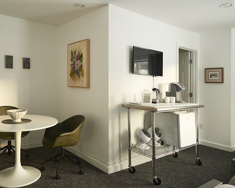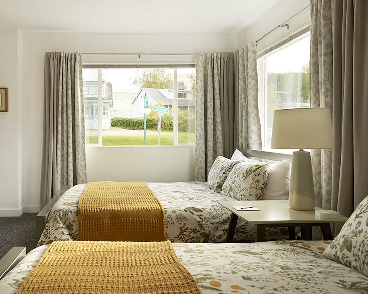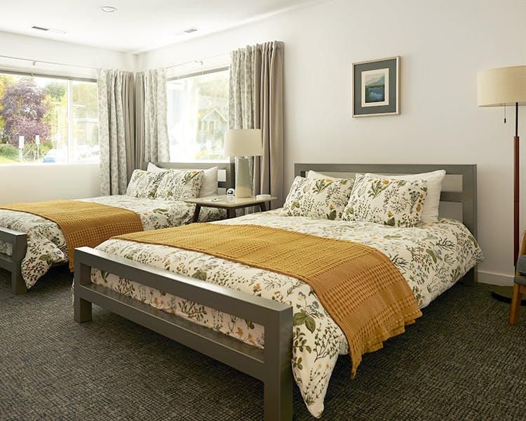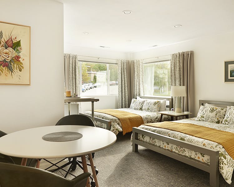 Enjoy two queen beds and a cozy sitting area with a small dining table—perfect for relaxing, enjoying a snack, or planning your day. A comfortable, welcoming space designed for a restful stay. This room has a private en suite bathroom.